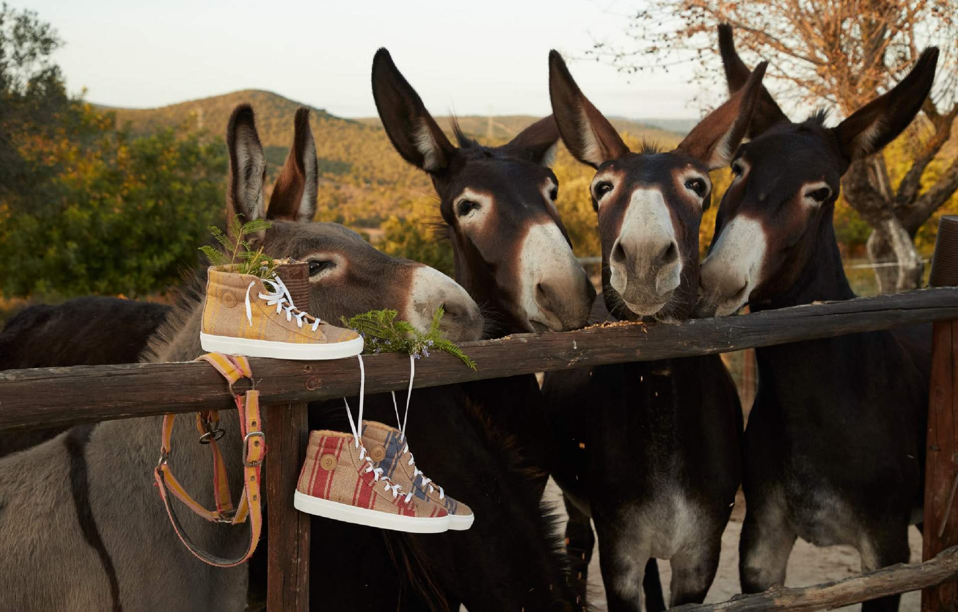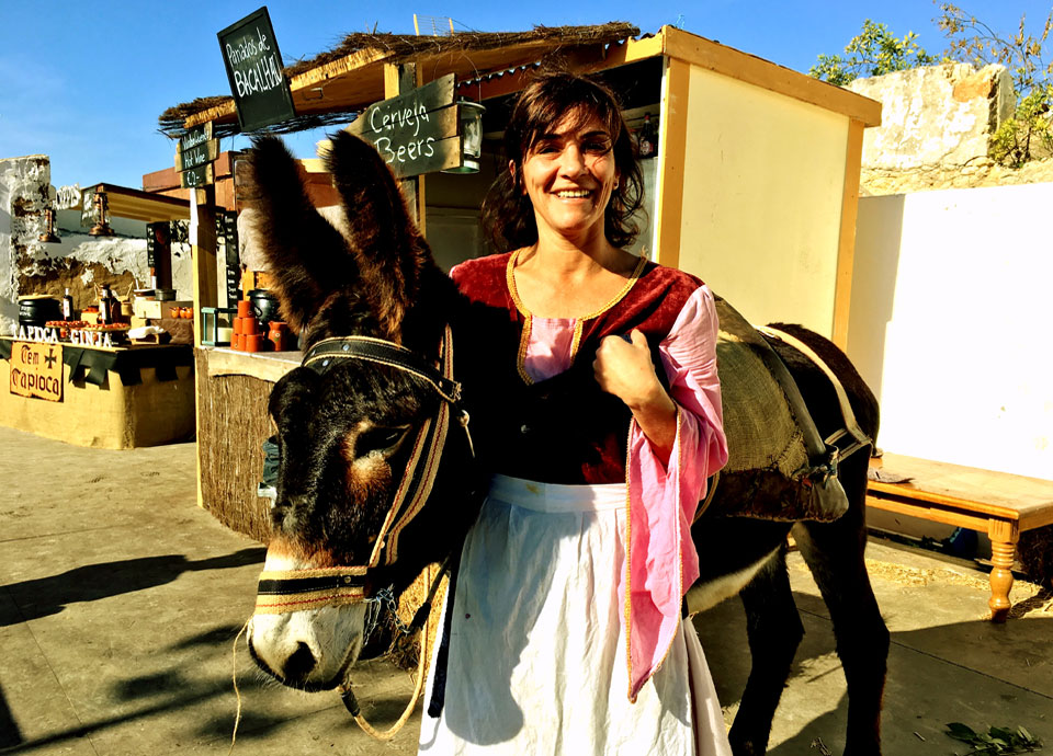 Motivos exteriores: Casa da quinta, lagoa natural, paisagem rural avistando a Serra de Monchique, jardim mediterrânico, árvores de fruto, canteiros de ervas aromáticas, terreno com amendoeiras, oliveiras, alfarrobeiras e figueiras, prado, celeiro de feno, cabana de madeira, área de pasto, galinheiro e animais da quinta: burros, patos, gansos, galinhas, cães e gatos.